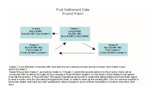 After the settlement period has passed, however, most firms will begin the process of confirming opening fails with counterparties. It is through this process that the communication starts to take place to identify these round robins and then to work them out. The actual clearance process will be more difficult as the number of firms in the daisy chain grows.