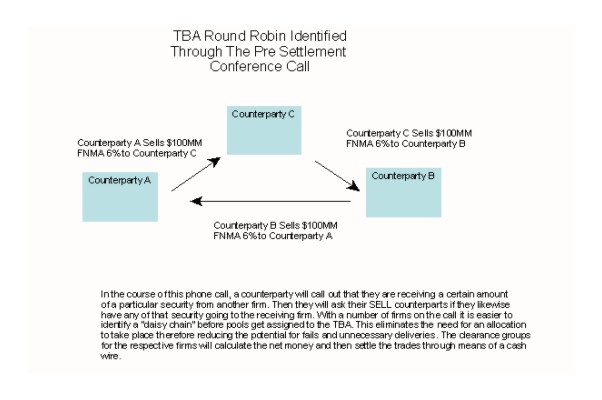 In the last few years, the dealer community has initiated a round robin call that takes place on the MBS 48-hour day. The call takes place in the morning when all settlement balance order (SBO) netout trades have been identified and broker trades have been given up. Attempts are made to identify the parties in these daisy chains in the current coupon securities. In this way, these calls reduce the number of TBA trades to be allocated and reduce potential fail risk.